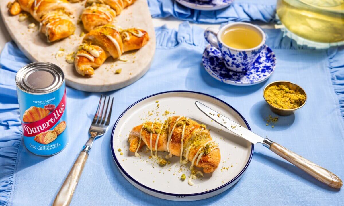 - Jaa mantelimassa kuuteen yhtä suureen osaan. Avaa purkki pakkauksen ohjeen mukaan ja rullaa croissant-taikina auki. Tee taikinan alaosaan pieni viilto ja aseta siihen pala mantelimassaa.
